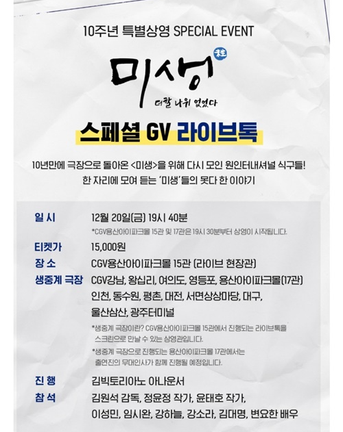 미생 방영 10주년 기념으로 CGV에서는 김원석 감독이 직접 선택한 레전드 회차 13화를 극장에서 볼 수 있으며, 배우들과 함께 미생에서 못다한 이야기를 들을 수 있는 스페셜 GV 라이브톡 이벤트를 진행한다고 합니다. 라이브 현장관은 CGV용산아이파크몰15관에서 진행되며, 라이브현장을 생중계로 볼 수 있는 생중계극장을 마련했다고 하니 관심있으신 분들은 12월12일 목요일 상영극장을 확인하셔서 [미생 : 더할 나위 없었다]를 예매해 보시기 바랍니다.