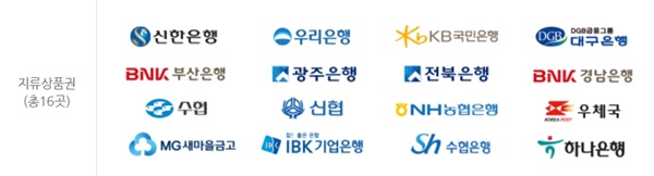 - 신한은행, 우리은행, KB국민은행, 대구은행, BNK부산은행, 광주은행, 전북은행, BNK경남은행, 수협, 신협, NH농협은행, 우체국, MG새마을금고, IBK기업은행, SH수협은행, 하나은행