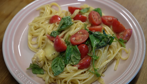 - 링귀니 면( 아무 파스타면이나 대체가능), 브리치즈, 방울토마토, 생바질 (없으면 루꼴라 생파슬리 참나물 대체가능) 소금, 후추, 올리브오일, 마늘 취향껏