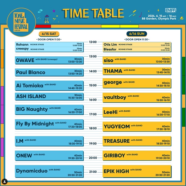 톤앤뮤직 페스티벌 2024 타임테이블이 공개됐습니다. 톤앤뮤직 페스티벌은 6월15일부터 16일까지 2틀간 진행되며, 올림픽공원88잔디공원에서 500분간 공연이 펼쳐집니다. 이 공연은 국내 유일 R&B, Soul Music 페스티벌로 국내 및 해외 아티스트들과 함께 즐거운 추억 만들어보시기 바랍니다.