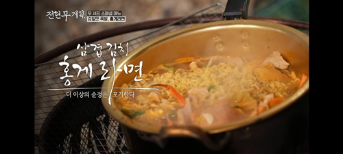 무계획식당의 세번째 메뉴는 홍게라면 입니다. 포항 특산물 홍게를 듬뿍 넣은 라면은 맛이 없을 수 없는 조합인데요. 홍게 와 함께 한돈 삼겹살과 김치까지 추가했답니다.