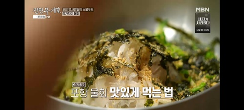 먹브로도 초장없이 포항 스타일로 도전해 봤습니다. 고추장의 진한 장맛에 모두들 감탄을 금치 못했는데요. 무침회 스타일을 좋아하시면 생수를 빼고 드시면 된다고 합니다. 고추장이 매운편이라 곽튜브는 생수를 넣는 걸 추천했구요, 매운맛을 좋아하는 전현무는 비벼지기 편할 정도만 소량의 물만 추가해서 비빔회 스타일로 즐기더라구요. 고추장만 넣으면 포항만의 오리지널 맛을 느끼실 수 있구요, 초장을 추가하게 되면 우리가 익히 아는 물회 스타일이라 맛은 있지만 독특함은 덜하다고 하네요.