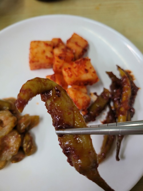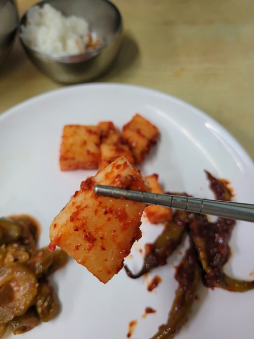 떙기는 맛이 있어요. 깍두기랑 오이장아찌도