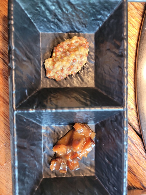기본 상차림으로 명이나물+궁채, 무생채, 꼬들빼기, 김치, 칠리소스, 멜젓, 소금, 파절임, 홀그레인 머스터드 등이 나옵니다. 고춧가루가 들어간 반찬들이 좀 매운편이었어요.
