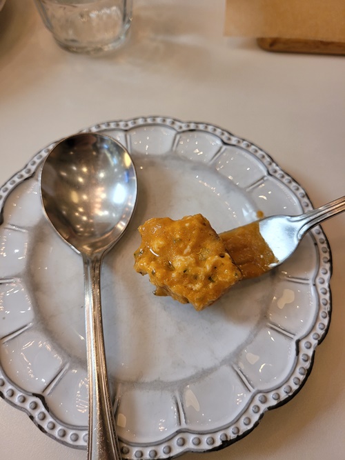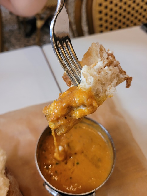 리코타치즈 멜트 & 바스크는 깜빠뉴 사이사이에 리코타 치즈가 듬뿍 발라져있고, 스파이시 바스크 스프에 빵을 찍어 먹는 메뉴로, 애피타이저 가격이 22.8으로 쎈 편이긴 했지만 친구가 먹어보고 싶어해서 주문을 해봤습니다.