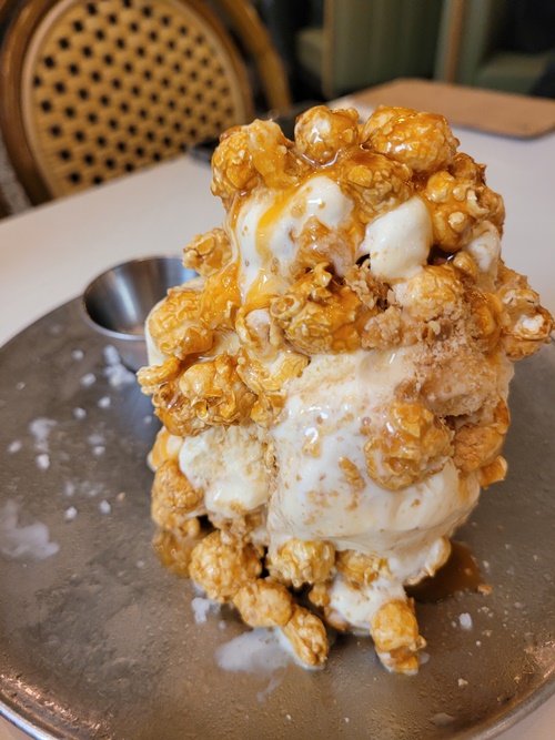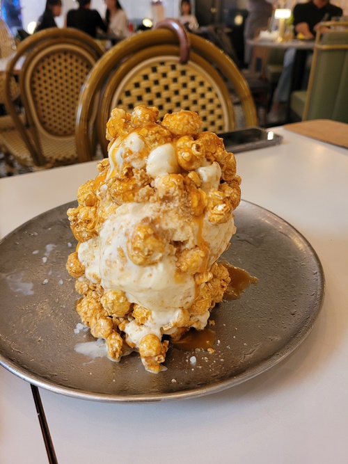 저희가 가장 기대했던 메뉴 팝콘 소금 아이스크림입니다. 아이스크림을 좋아하기도 하고 팝콘 소금 아이스크림은 다른곳에서 본적이 없는 메뉴라 맛이 궁금했어요.