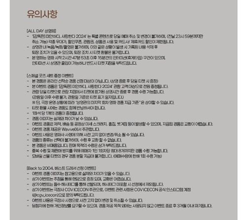 - 관람고객 전원에게 감독판 미안하다 사랑한다 2024 스폐셜 굿즈 & 포스터 증정 = 100% 당첨 매점 교환권 제공 (1좌석 1세트)