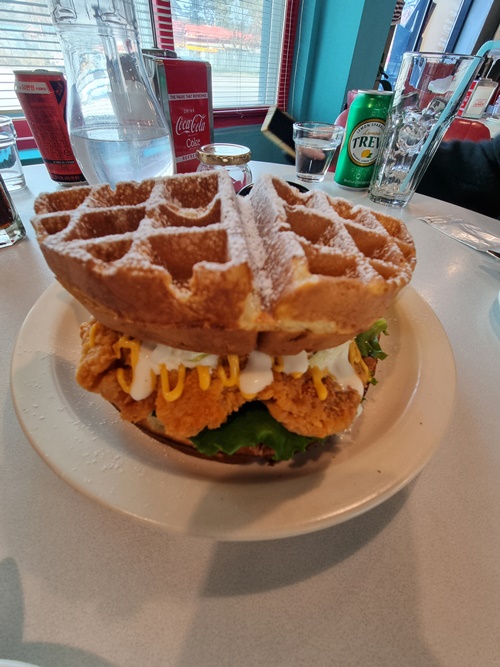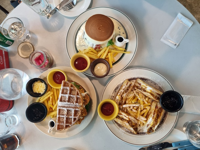 이곳은 팬케이크 버거와 치킨와플샌드가 유명한 곳이라고 해서 방문을 했는데요. 저희가 주문한 메뉴는 팬케이크버거 크림 머쉬룸, 폴드포크 몬테크리스토, 바닐라 쉐이크, 콜라 2개, 트레비를 주문했습니다. 오리지날 팬케이크버거를 시킬까 고민을 했는데 hit가 적혀있는 걸 보고 크림 머쉬룸으로 시켜봤어요~!
