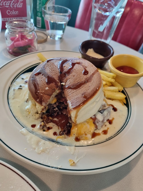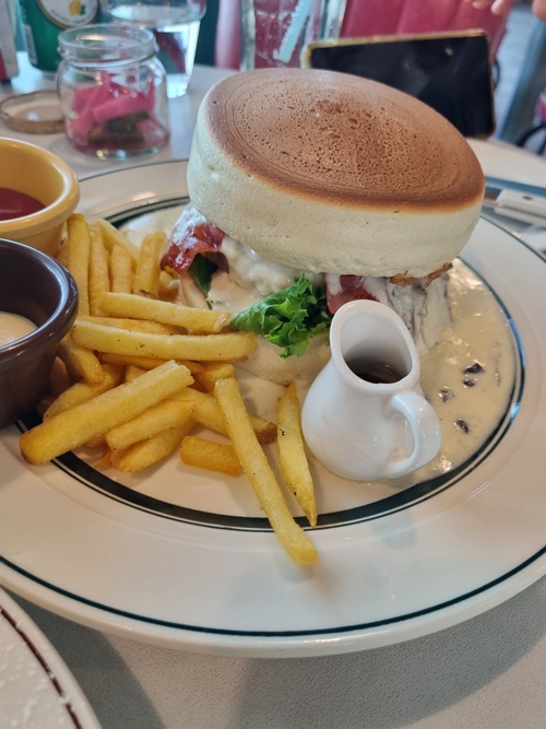 그리고 가장 맛있었던 팬케이크버거 크림머쉬룸 입니다. 팬케이크는 부드럽고 폭신한 식감에 계란 비린내 없이 맛있구요. 이곳에서 직접 만들었다는 패티와 소스, 시럽까지 조합이 정말 좋더라구요. 크림 머쉬룸 소스도 느끼하지 않았어요. 팬케이크에 패티?라는 조합이 굉장히 낯설었는데 이곳에서 먹어보니 이 조합 강추입니다. 이 메뉴 먹으러 이곳은 다시 와야겠더라구요. 팬케이크버거 꼭 드셔보세요!