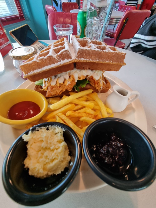 치킨와플샌드는 두툼한 와플안에 닭다리살 패티와 코올슬로가 들어가 있구요 사이드로 블루베리잼, 케찹, 감자샐러드, 케찹이 함께 나옵니다. 와플과 닭이 어울리나라고 생각을 했는데 의외로 괜찮더라구요. 코올슬로가 상큼해서 좋아요.
